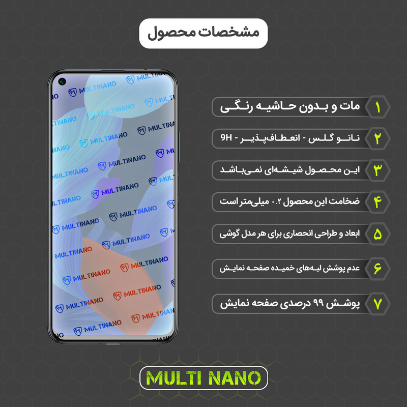 محافظ صفحه نمایش نانو Multi Nano ، گلسی باساختار مات و بدون حاشیه رنگی که توسط فناوری نانو ساخته شده و از ضخامت 0.2 میلی متری برخوردار است.(شیشه ای و تلق نمی باشد) و بخاطر نانو بودن باعث مقاومت بسیار بیشتر در برابر ضربه نسبت به گلس های معمولی است، همچنین کاملا نشکن است و در صورت برخورد ضربه نخواهد شکست. مات بودن این گلس باعث میشود تا نور روی صفحه پخش شود. از صفحه نمایش گوشی موبایل (هوآوی نوا 5 تی) در برابر ضربات احتمالی , خط و خش و... محافظت میکند. محافظ صفحه نمایش مات نانو مولتی نانو قسمت های خمیده (curved) صفحه گوشی را پوشش نمیدهد اما برای گوشی هایی که خمیدگی ندارند، صفحه نمایش را به خوبی پوشش میدهد. با توجه به ضخامت کم این محصول نسبت به گلس های 3 میل، برای گوشی هایی که حسگر اثر انگشت آن روی صفحه نمایش تعبیه شده اند، نیز پیشنهاد میشود.