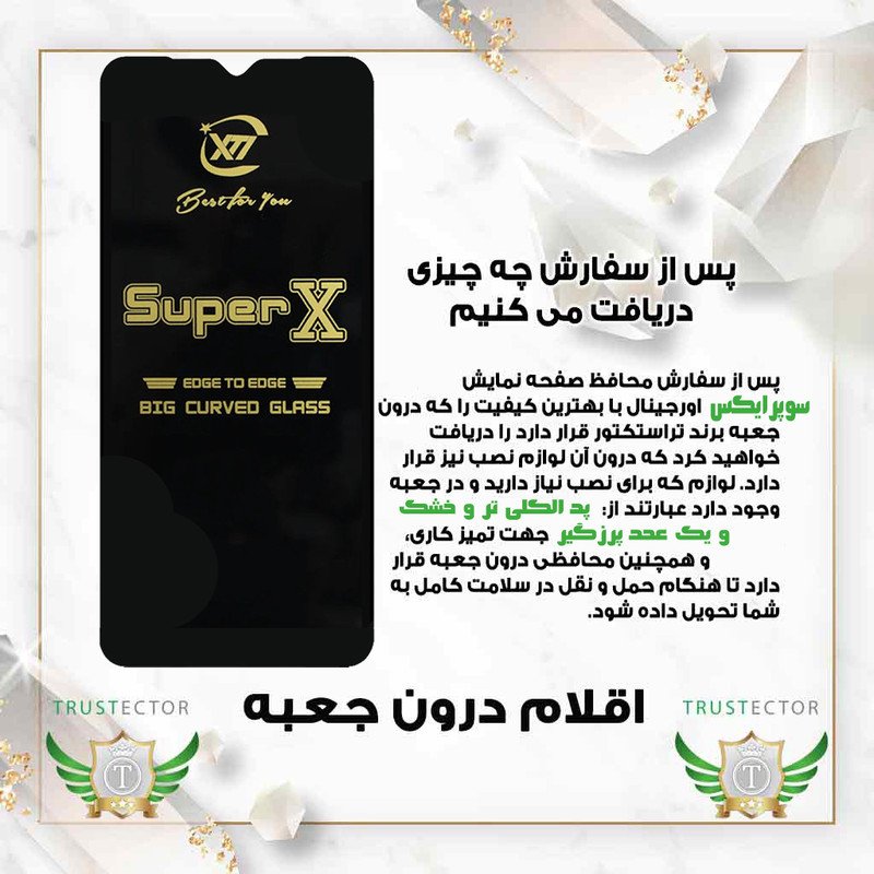 محافظ صفحه نمایش SuperX گلسی از جنس شیشه حرارت دیده فشرده شده با مقاومت 9H، بسیار شفاف و ضد خط و خش است. گلس SuperX با حاشیه مشکی در لبه ها و پوشش دهی کامل صفحه نمایش سلامت نمایشگر شما را تضمین می کند و مانع آسیب رسیدن به تاچ و ال سی دی گوشی شما خواهد شد.گلس SuperX ضد اثر انگشت است و از قابلیت تاچ سریع گوشی نمی کاهد.