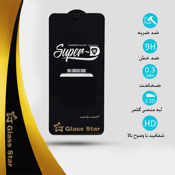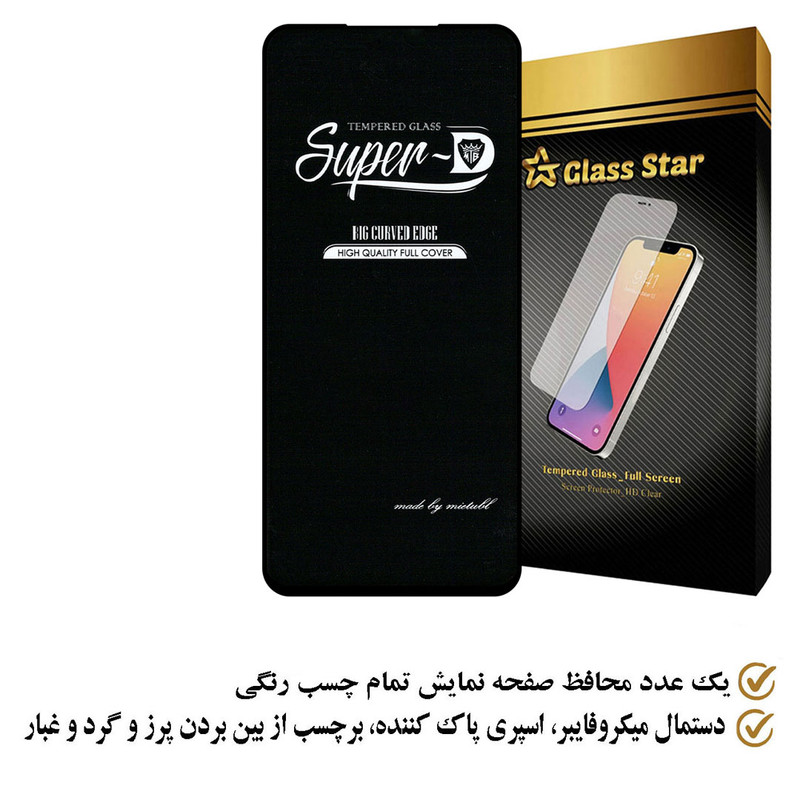 صفحه نمایش گوشی بسیار حساس است و ممکن است در اثر ضربه یا خط و خش آسیب ببیند. محافظ صفحه نمایش گلس استار مدل سوپردی (SUPER-D) به عنوان یک محافظ قدرتمند و با کیفیت است و استفاده از آن برای گوشی موبایل شما یک گزینه ایده آل به شمار می رود. این محافظ صفحه نمایش، تمام قسمت های صفحه نمایش را به صورت کامل پوشش داده و اجازه نمی دهد به صفحه نمایش گوشی شما آسیبی برسد. حاشیه اطراف آن، ابعاد صفحه گوشی شما را کوچک نمی کند و دارای قابلیت هایی همچون نصب آسان، عدم ایجاد حباب ، لمس روان و سریع و همچنین عدم کاهش کیفیت تاچ و شفافیت صفحه نمایش است که کار کردن با گوشی را برای شما راحت تر می کند. مکانیزم ساخت گلس مدل سوپر دی، از جنس شیشه حرارت دیده می باشد. لبه های گرد و منحنی دارد و در برابر ضربه و خط و خش از مقاومت بالایی برخوردار است که از آسیب دیدن صفحه نمایش نیز جلوگیری می کند. در واقع گلس مدل SUPER-D با توجه به کیفیت قابل توجه آن، قیمت مناسبی داشته که شما می توانید بدون نگرانی آن را برای گوشی خود تهیه نمائید.این گلس به همراه یک اسپری الکل و دستمال که برای تمیز کردن صفحه نمایش است ارسال می شود.