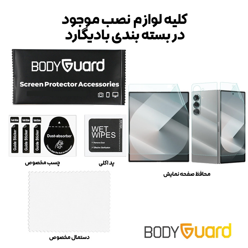 محافظ صفحه نمایش بزرگ - محافظ صفحه نمایش کوچک - محافظ پشت گوشی - دستمال مرطوب - دستمال خشک - چسب - کاردک بزرگ مخصوص فولد