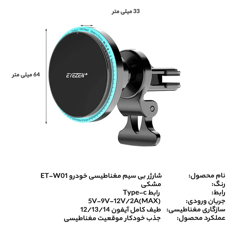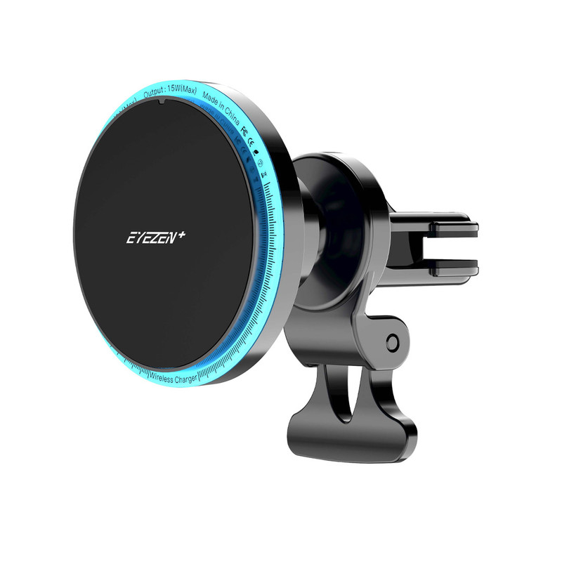هولدر وایرلس برند EYEZEN مدل ET-W01 هم قادر به نگهداری موبایل شما میباشید و هم به صورت بی سیم دستگاه را شارژ میکند.این پایه نگهدارنده موبایل با خروجی 15 وات دیگر نمیگذارد شارژ دستگاهتان تخلیه شود.ظاهر این محصول بسیار شیک و مدرن است و ال ای دی دور مگنت به زیبایی بیشتر این محصول کمک میکند.همچنین مگنت بسیار قوی این دستگاه به شما اجازه میدهد تا بدون هیچگونه نگرانی در خودرو یا روی میز خود از آن استفاده کنید.در جعبه محصول کابل TYPE-C جهت اتصال به فندکی ماشین یا هرگونه خروجی مناسب فراهم شده است.