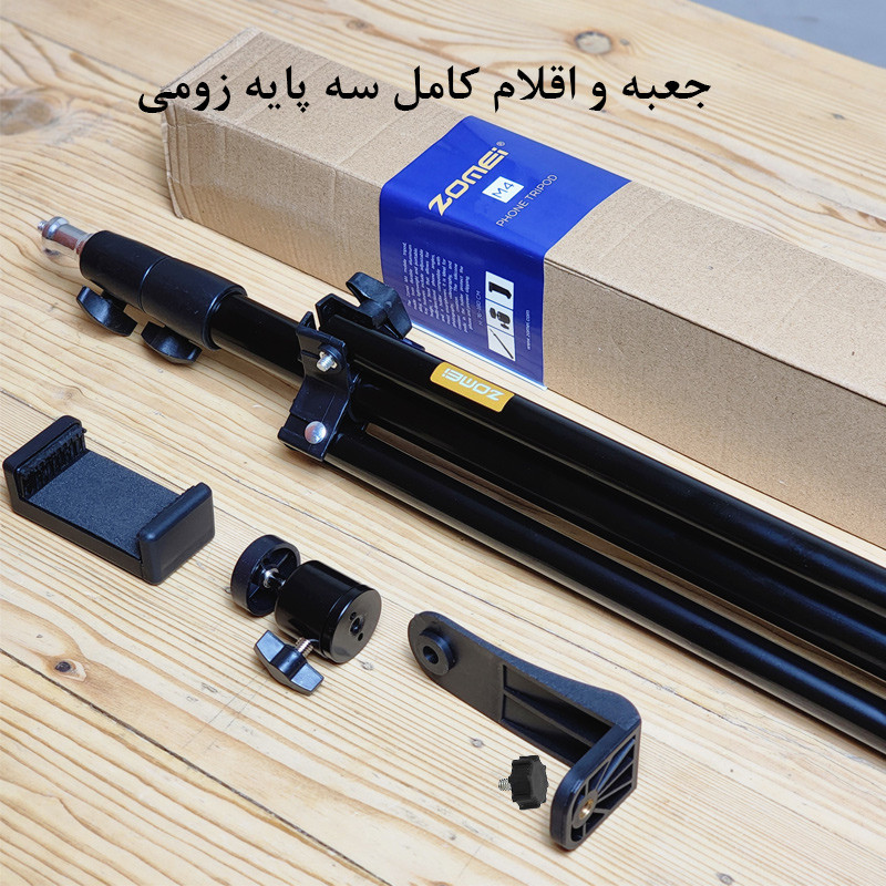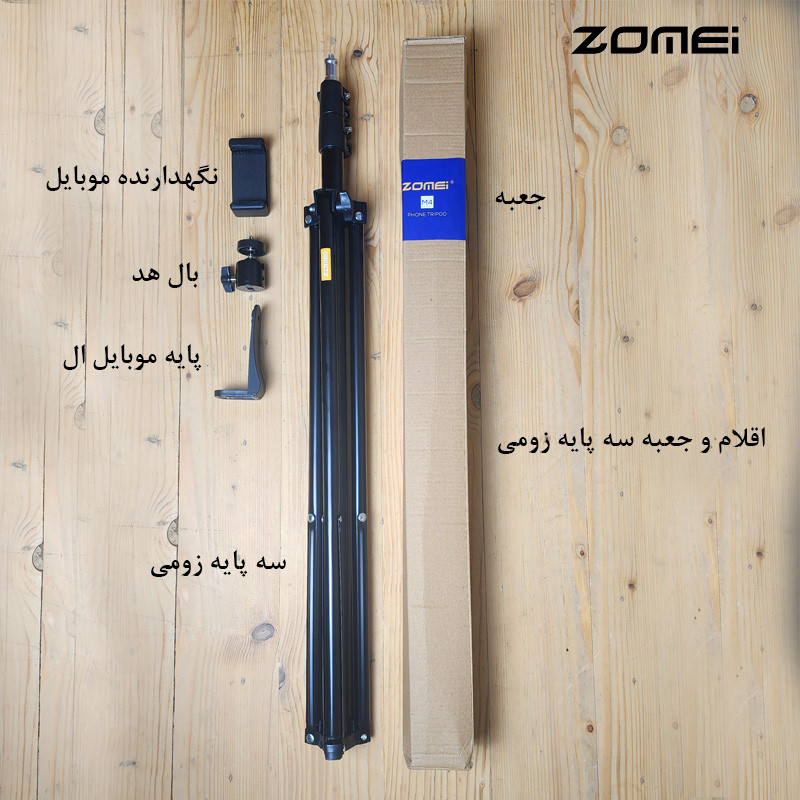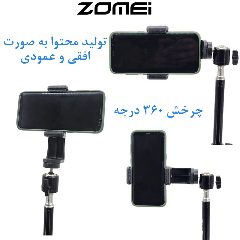 سه پایه تولید محتوا مناسب گوشی موبایل از برند معتبر Zomei برای شما امکان عکاسی و فیلمبرداری را فراهم می آورد. اگر شما نیز برای تولید محتوا به یک سه پایه با ارتفاع بلند نیاز دارید پیشنهاد ما به شما استفاده از سه پایه زومی است. با استفاده از بال هد موجود بر روی این سه پایه می توانید به راحتی به گوشی خود زاویه بدهید ، چرخش 360 درجه داشته باشید و یا حتی از زاویه بالا به پایین عکاسی و فیلمبرداری کنید. نگهدارنده موجود بر روی سه پایه زومی استاندارد و دارای جای پیچ های فلزی است که بسیار مقاوم و به هیچ عنوان هرز نمی شود.از این نگهدارنده می توانید برای کلیه گوشی های موبایل با عرض 5.5 تا 8.5 سانتی متر استفاده کنید.حداقل ارتفاع سه پایه زومی 68 سانتی متر است و برای تولید محتوا در ارتفاع کم نیز مناسب است.سه پایه زومی دارای پیچ استاندارد 1.4 اینچ است و علاوه بر نگهدارنده موبایل می توانید انواع تجهیزات عکاسی و نورپردازی ( مانند میکروفون ، رینگ لایت ، پنلهای ال ای دی و ... ) با جای پیچ 1.4 اینچ تا وزن 1 کیلوگرم را بر روی آن استفاده کنید همچنین سه پایه Zomei دارای مانت استاندارد تجهیزات نور نیز هست که می توانید انواع فلاش های استودیو ، رینگ لایت های حرفه ای و ... تا وزن 1 کیلوگرم را بر روی آن متصل کنید.