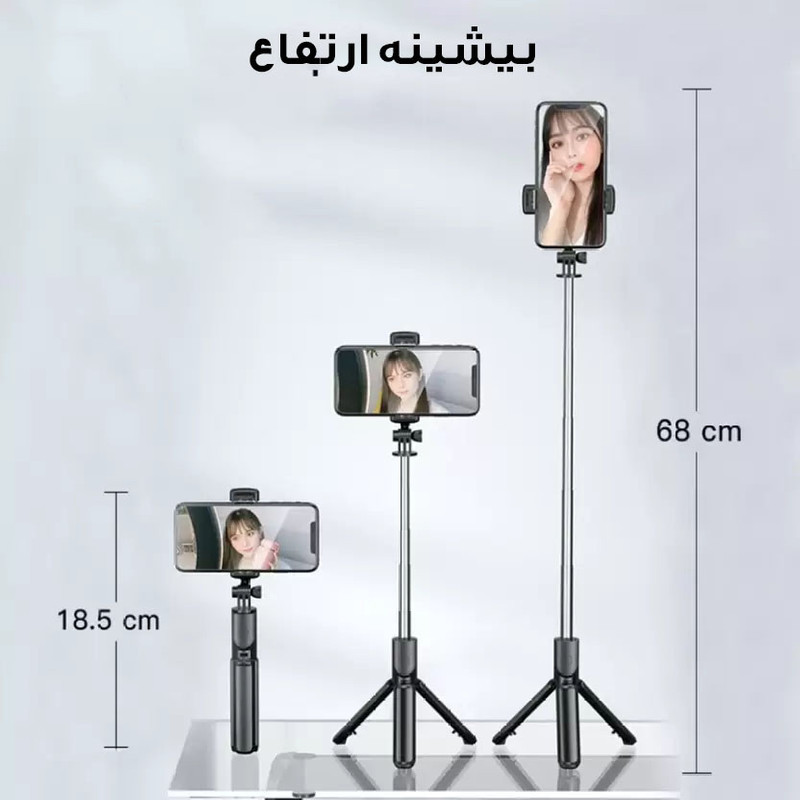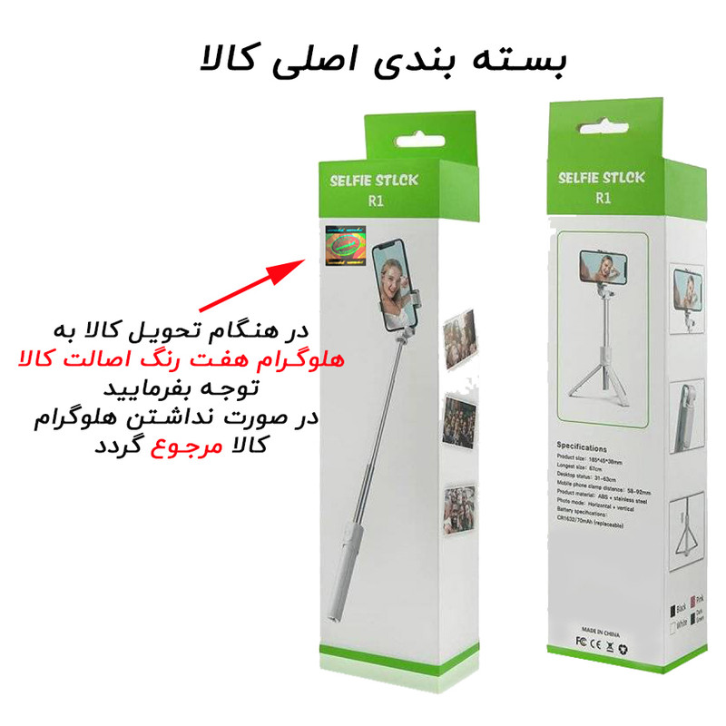 پایهی مونوپاد R1 با طول حداکثر 70سانتیمتر، ابزاری مناسب برای عکاسی سلفی با گوشیهای موبایل اندروید و آیفون است. این محصول بدنهای از جنس فلزی دارد. کمترین طول هم در حالتی که تمام تکهها جمع شدهاند، 18.5 سانتیمتر است. این محصول به لطف گریپ پلاستیکی، بهراحتی در دست نگهداشته و کنترل میشود. قسمت نگهدارندهی گوشی، به پایهای متصل شده که از قابلیت چرخش 360 درجه و خموراستشدن برای تنظیم زاویهی دلخواه برخوردار است. افرادی که به گرفتن عکس سلفی تمایلی ندارند، میتوانند آن را در حالت سه پایه قرار دهند و به کمک ریموتکنترلی که روی بدنهی مونوپاد قرار گرفته و قابل جداشدن از بدنهی مونوپاد است، اقدام به عکاسی کنند. ریموت کنترل آن با گوشیهای اندروید نسخهی 4.3 و iOS نسخهی 6.0 به بالا سازگار است.هنگام بازدید از یک موزه یا یک بنای تاریخی قطعاً شما ترجیح میدهید که تصاویر واضحتری از فضای اطراف خود داشته باشید و به همین دلیل دیگر سلفی گرفتن با دستان خالی گزینهای مناسب برای این نوع از عکاسی نیست. مونوپاد ها برای همچین شرایطی گزینهای عالی هستند.اما حمل مونوپاد ها را میتوان مشکل عمده آنها دانست که اغلب از وزن زیادشان ناشی میشود،بسیاری از افراد هستند که از گوشی خود برای تماستصویری، آموزش تصویری، شرکت در ویدیو کنفرانس، لایو در شبکههای اجتماعی، ضبط کلیپ و مواردی از این دست استفادههای بسیار زیادی میکنند. برای این موضوع این افراد همیشه به دنبال جایی یا جایگاهی هستند که گوشی خود را در آن قرار دهند و گوشی به صورت ثابت و بدون حرکت باشد تا حاصل کار آنها تصویری بدون لرزش و با کادربندی خوبی از آب درآید. برای بهدست آمدن این ویژگیها میتوانید از سه پایه نگهدارنده گوشی موبایل مدل R1 استفاده کنید. این هولدر دارای سه عدد پایه است که باعث تثبیت گوشی میشود. تنها کاری که شما باید انجام دهید این است که گوشی را روی این پایه تنظیم کنید و در پشت میز خود بنشینید و به کار خود بپردازید یا آن را روی میز قرار دهید و ایستاده به آموزش بپردازید. گفتنی است این محصول برای گوشیهایی تا اندازه 6.5 اینچ مناسب خواهد بود.