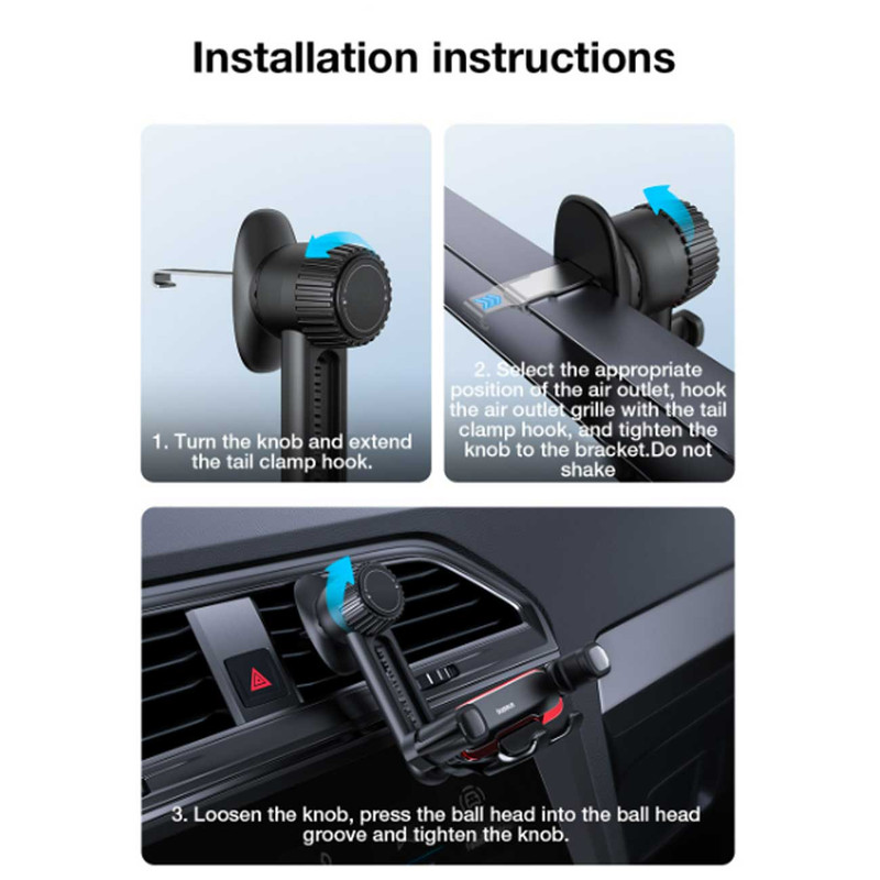 با استفاده از گیره به دریچه هوای خودرو متصل میشود و به خوبی در دسترس است. در بخش زیری آن هم شیاری برای عبور کابل شارژ در نظر گرفته شده تا هنگام اتصال گوشی به شارژر فندکی امکان استفاده از پایه گوشی هم وجود داشته باشد.