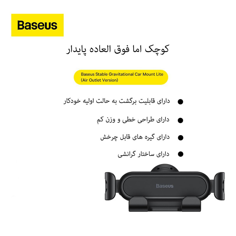 طراحی هولدر Baseus به گونه ای است که با یک دست بتوانید گوشی خود را روی هولدر قرار دهید. و به محض برداشتن گوشی فنرهای آن به طور اتوماتیک بسته میشود و به حالت اولیه در میاید. بازوهای گیره نگه دارنده گوشی با اتصال قوی فنری به هم متصل شده اند تا خیال شما بابت ناهمواری های جاده و دست اندازها بر طرف شود. هولدر بیسوس قابلیت چرخش 360 درجه دارد که باعث می شود بتوانید گوشی خود را به صورت عمودی یا افقی قرار دهید.