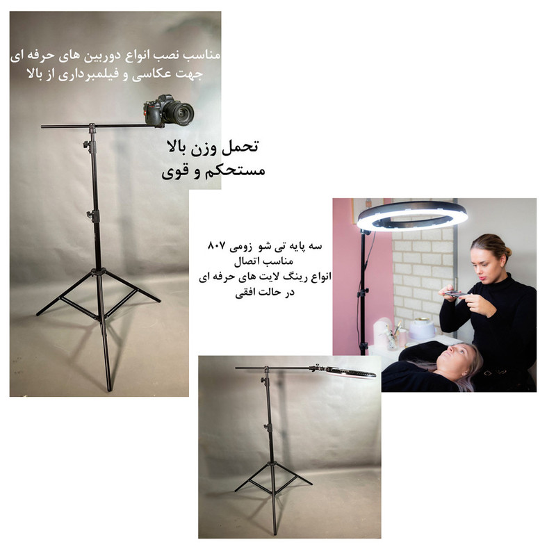 اگر شما هم جز آن دسته از افرادی هستید که با موبایل خود عکاسی و فیلمبرداری می کنید، می دانید که سه پایه موبایل چقدر مهم است. عکاسی و فیلمبرداری بدون لرزش دست می تواند حس بهتری را به ببینیده منتقل کند. سه پایه موبایل افقی به شما امکان می دهد تا با موبایل و از زاویه بالا عکاسی و فیلمبرداری کنید. به این ترتیب، بسیاری از عکس های تبلیغاتی و یا ویدیوهای آموزشی و آنباکسینگ ها از زاویه بالا و با کمک سه پایه موبایل افقی (سه پایه با قابلیت Tشدن) تهیه می شود. سه پایه موبایل زومی Pro Smartphone از جنس آلومینیوم بوده و با داشتن یک میله افقی، برای عکاسی و فیلمبرداری از بالا مناسب است.سه پایه موبایل افقی قابلیت چرخش 360 درجه هد، تنظیم ارتفاع و استفاد از موبایل در حالت عمودی و افقی را دارد. با استفاده از این ویژگی ها شما می توانید عکاسی و فیلمبرداری را از زوایای مختلف تجربه کنید. هولدر موبایل این سه پایه از 5.5 سانتی متر تا 8.5 سانتی متر قابلیت باز شدن دارد.یکی دیگر از ویژگی های سه پایه موبایل Zomei Pro Smartphone با قابلیت T شدن، وجود بال هد و امکان زاویه دهی 360 درجه به موبایل و همچنین عکاسی و فیلمبرداری افقی و عمودی است.به راحتی انواع رینگ لایت های حرفه ای سنگین ، فلاش های استودیویی ، پنل های ال ای دی عکاسی و یا فیلمبرداری و ... را به حالت افقی و در زاویه بالا استفاده کنید.طول میله افقی زومی 74 سانتی متر است و می توانید نسبت به وزن تجهیزاتی که دارید آن را تنظیم کنید.حداکثر ارتفاع سه پایه T شو زومی 260 سانتی متر و بسیار مستحکم و قوی است.مزیت سه پایه افقی زومی نسبت به مدل های مشابه بازار قسمت پایین سه پایه است که بسیار بزرگتر از مدل های معمول است به همین دلیل از استحکام بالا و همچنین تحمل وزن بیشتری برخوردار است.سری سه پایه نور در این مدل متحرک است و شما می توانید آن را به حالت افقی و یا عمودی نصب کنید و همچنین دارای پیچ استاندارد 1.4 و 3.8 اینچ برای پیچ کردن انواع تجهیزات است.کیف سه پایه زومی با طول 105 سانتی متر مناسب جهت حمل سه پایه زومی می باشد که یک بند جهت تغییر سایز نیز دارد.کیف زومی از برزنت و در مقابل قطرات آب مقاوم است، همچنین در انتهای کیف سه پایه زومی یک عدد پد ضربه گیر جهت محافظت از سه پایه در داخل آن دوخته شده است.وزن سه پایه به تنهایی 2700 گرم است.