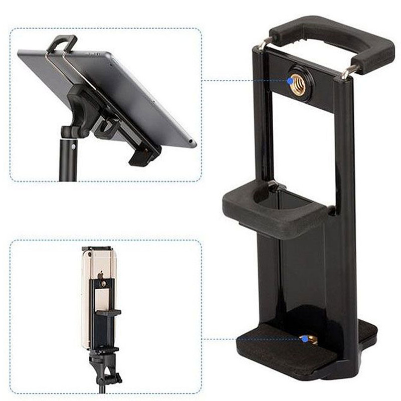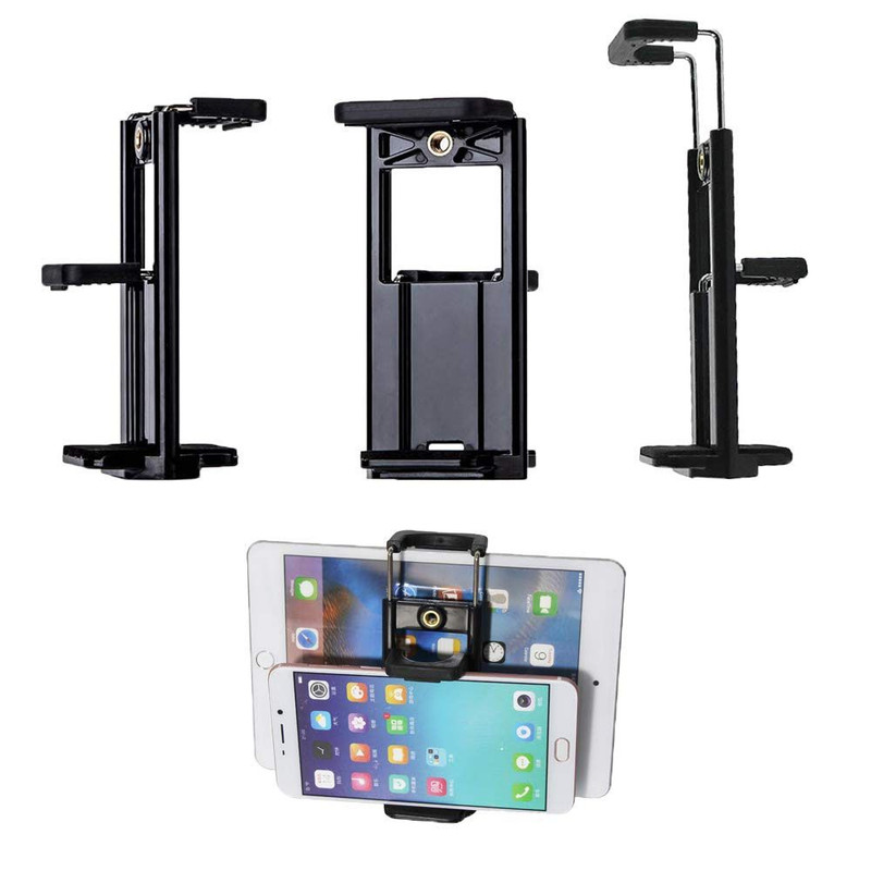 -سایز:8×6.5×14 سانتی متر -امکان نصب روی انواع سه پایه و تک پایه -امکان نصب انواع گوشی تلفن همراه و تبلت -این هولدر روی پیچ 1/4 اینچی نصب میشود -گوشی موبایل و یا تبلت بصورت جداگانه یا همزمان در میان یکی از گیرههای فنری دو طرف آن قرار خواهد گرفت