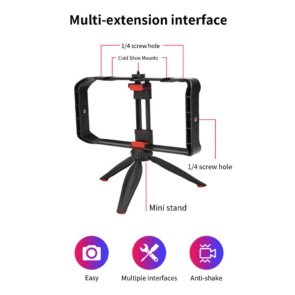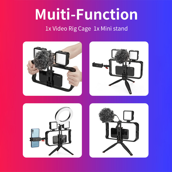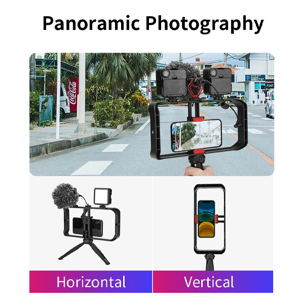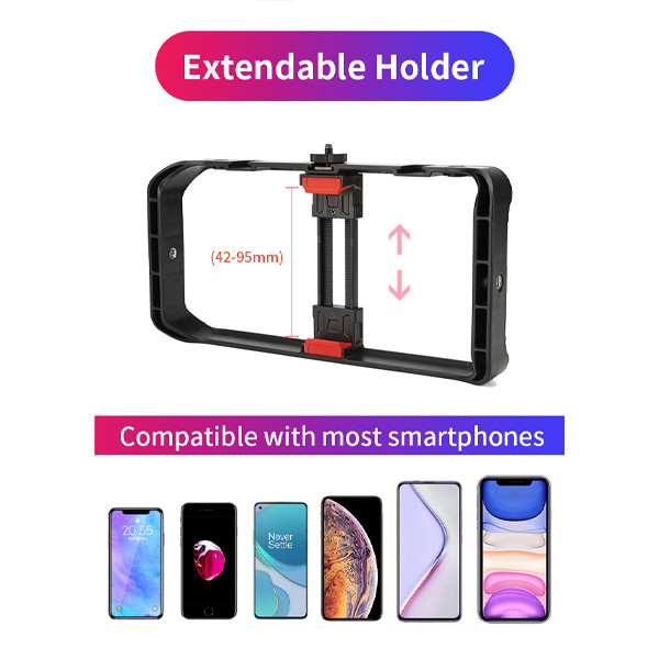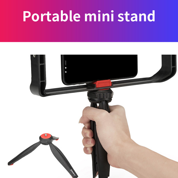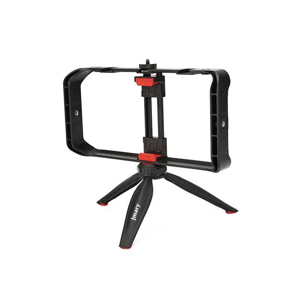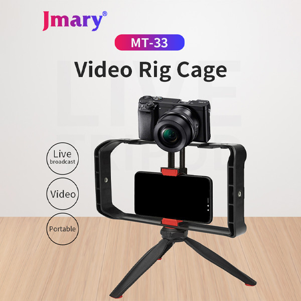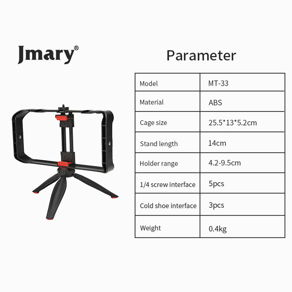 با سه پایه Jmary MT-33 شما می توانید به راحتی 4 دستگاه مختلف را به این سه پایه متصل نمایید شاید برای شما سوال پیش آمده که این 4 دستگاه میتوانند چه محصولاتی باشند؟ به لطف محفظه نگهدارنده آن می توانید تلفن همراه خود را به راحتی در آن قرار دهید با وجود سوراخ های موجود در اطراف این سه پایه می توانید به راحتی نور LED و میکروفن و یا حتی دوربین ثانویه خود را در این سه پایه قرار دهید. ایده آل برای ضبط فیلم های با کیفیت بالا - همزمان نگه داشتن دو دستگیره می تواند تلفن همراه را به راحتی حفظ کنید و با این کار لرزش را به شدت کاهش دهید. ابزاری خارق العاده برای گرفتن فیلم با کیفیت بالاتر. می توانید آن را با هر Trpod ، Slider ، Stabilizer یا Dollys و ... نصب کنید و با این کار کیفیت تصویر برداری خود را افزایش دهید. سازگار با همه تلفن های هوشمند (4 اینچ تا 7 اینچ). برای گرفتن فیلم های حرفه ای می توانید همزمان نور LED اضافی ، میکروفون یا سایر ضمیمه ها را اضافه کنید.چراغ LED را ضمیمه کرده و می توانید در صحنه های مختلف فیلم بگیرید.به عنوان مثال ، در شب یا در محیط تاریک فیلم بگیرید