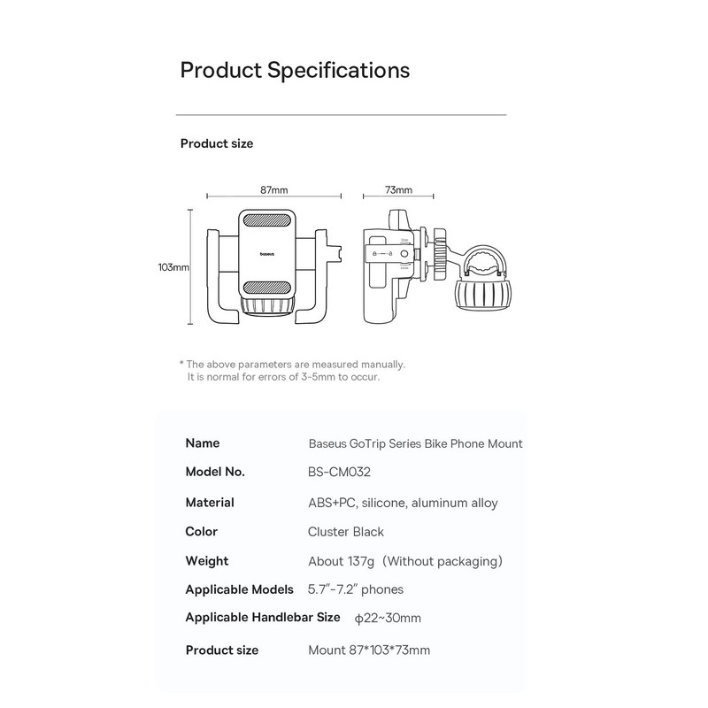 جنس هولدر دوچرخه و موتور بیسوس Baseus GoTrip BSCMO3Z از پلاستیک باکیفیت از نوع ABS و PC همراه با سیلیکون و آلومینیوم است که از هرگونه آسیب و خط و خش جلوگیری می کند. همچنین این هولدر دارای قابلیت ضد شوک و ضد لرزش است. هولدر گوشی بیسوس Baseus GoTrip مناسب برای انواع گوشی موبایل با سایزهای 5.7 تا نهایتاً 7.2 اینچی می باشد عرض دهانه هولدر 22 تا 33 میلیمتر باز می شود بنابراین برای انواع گوشی ها و دوچرخه ها مناسب است و البته از کیفیت ساخت بالایی برخوردار می باشد.