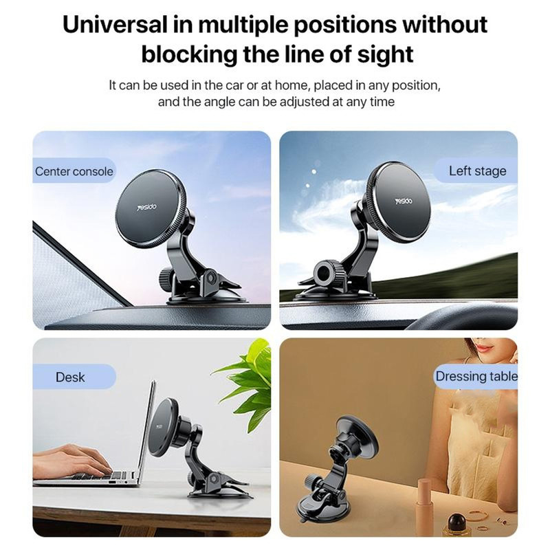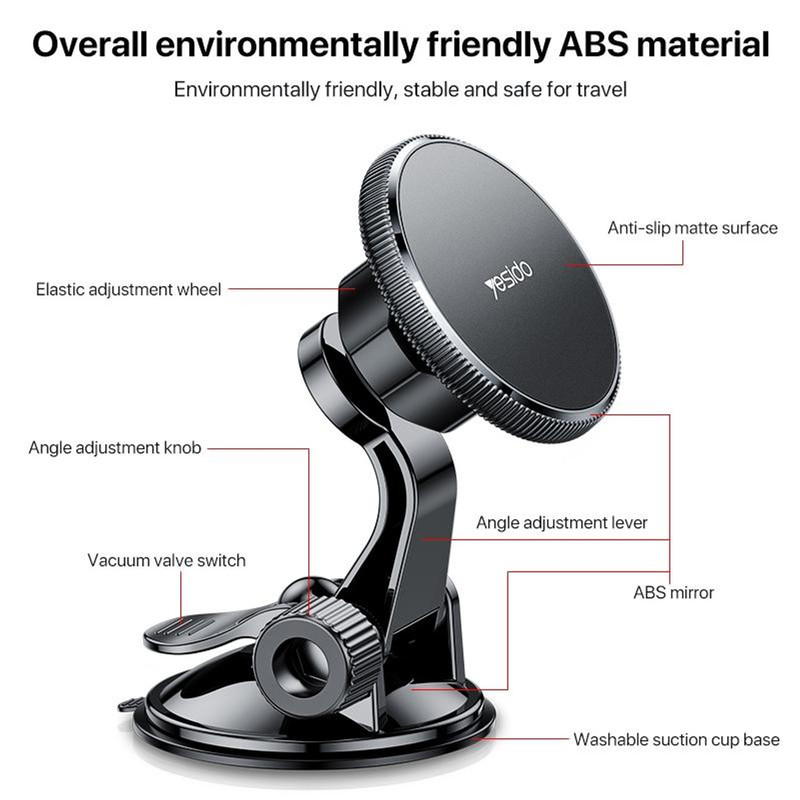 زیر پایه این هولدر، مکنده ای قدرتمندی وجود دارد که به سطح مورد نظر میچسبد و به راحتی از آن جدا نمیشود. به دلیل نوع اتصال این استند کاربران میتوانند از آن برای هر مدل اتومبیل استفاده کنند و آن را روی شیشه یا داشبورد بچسبانند. البته این استند برای انواع سطوح دیگر مانند میز و ... نیز قابل استفاده است. این هولدر، با استفاده از نیروی مغناطیسی (آهن ربایی) گوشی شما را نگه می دارد. همراه محصول برچسب آهن ربایی به شکل گرد وجود دارد که می توانید آن را به پشت گوشی و یا قاب آن چسبانده تا گوشی روی هولدر قرار بگیرد.کاربردیترین ویژگی این پایه نگهدارنده گوشی، قابلیت چرخش 360 درجه آن است و کاربران میتوانند سَری استند را در هر جهتی بچرخانند. به همین دلیل افراد میتوانند استند را در هر زاویهای که بخواهند و متناسب با نیاز خود تنظیم کنند تا بیشترین تسلط را روی صفحه نماش گوشی خود داشته باشند.