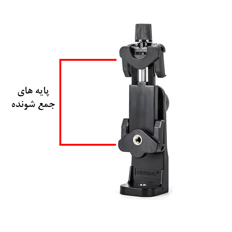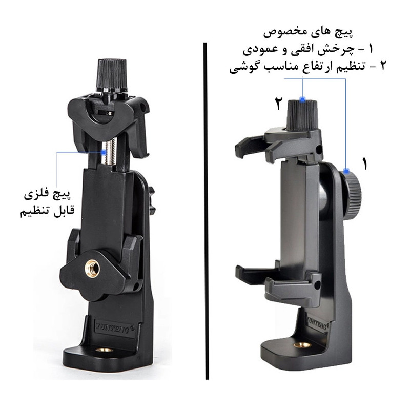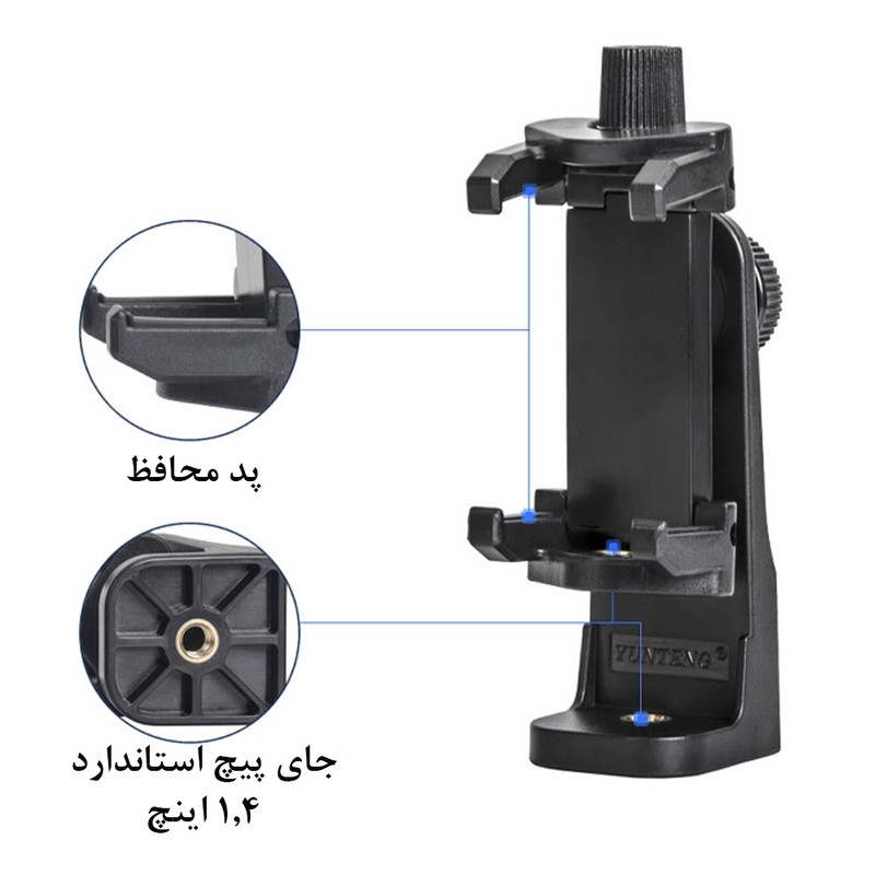 پایه نگهدارنده گوشی موبایل دوجهته YUNTENG با قابلیت چرخش 360 درجه ، مناسب برای عکاسی با موبایل در دو جهت افقی و عمودی می باشد. جنس این پایه نگهدارنده از پلاستیک فشرده بوده و 55 گرم وزن دارد. هولدر موبایل Yunteng، دارای جای پیچ استاندارد 1.4 اینچ می باشد و امکان اتصال به انواع سه پایه عکاسی ، سه پایه فیلمبرداری ، مونوپاد عکاسی و … را دارد. پایه نگهدارنده گوشی موبایل Yunteng برای ساخت ویدئو و تولید محتوا در همه جهات مناسب است. به کمک این پایه نگهدارنده می توانید در دو جهت افقی و عمودی بدون لرزش، عکاسی یا فیلمبرداری کنید و همچنین به صورت 360 درجه گوشی را بچرخانید.از ویژگی های منحصر به فرد هولدر موبایل یانتنگ می توان به مانت فلزی آن و همچنین وجود پد برای جلوگیری از آسیب به گوشی اشاره کرد. دهانه هولدر در حالت معمولی 5.5 سانتیمتر و در حالت باز 10.5 سانتیمتر می باشد.همانطور که می دانید بیشتر نگهدارنده های موبایل حالت فنری دارند و امکان فشار و یا صدمه زدن به گوشی وجود دارد. یکی تفاوت های این پایه گوشی با سایر هولدرها، باز شدن آن به صورت پیچی است. بدین ترتیب بدون نگرانی از آسیب به موبایل خود می توانید از آن استفاده نمایید.