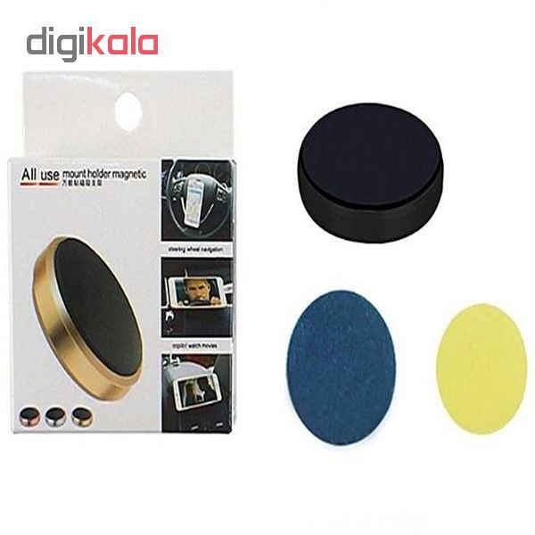 هولدر همه کاره و همه فن حریف می باشد که در محلی قادر به نصب و چسباندن آن هستید.شما قادر هستید این هولدر را در محلی نصب کرده و از آن استفاده های مختلف کنید.درون بسته این پایه نگهدارنده یک قطعه فلزی و یک قطعه فومی وجود دارد که قطعی فومی به پشت هولدر چسبیده و جهت چسباندن هولدر به مکان های مختلف به کار می رود(این قطعه فومی چسبندگی بالایی داشته و با چسبندگی بالا هولدر را در محلی می توان توسط آن چسباند) و قطعه فلزی نیز به پشت دستگاه مورد نظر چسبیده تا پس از نزدیک شدن به هولدر به خوبی مهار شود. این هولدر از آهنربای قدرتمند که قادر است دستگاه متصل به خود را به خوبی در هر شرایطی با ثبات بالا مهار کند.توسط این محصول شما می توانید هر محصول فلزی یا اگر فلزی نیست با چسباندن قطعه فلزی موجود در پک به آن،آن را به خوبی توسط هولدر مهار کنید.شما از این محصول می توانید در هر مکانی مانند: دفتر کار،خودرو،منزل ،پشت صندلی اتومبیل،داشبورد،روی فرمان،روی دیوار،بدنه یخچال،مانیتور و به طور کل هر محلی استفاده کنید.از مزیت های All use قابل استفاده بدون آن در تمامی زوایا و عدم داشتن محدودیت در سایز دستگاه ( از 1 تا 7 اینچ) می باشد.این پایه نگهدارنده دارای یک پنل دایره ای شکل با قدرت جذب بالا می باشد و دارای آهنربایی بوده که کافیست دستگاه مورد نظر خود را به آن نزدیک کنید تا به آن بچسبد و توسط پایه مهار شود..با طراحی شیک و زیبا و جمع و جور این هولدر کمترین جایی را اشغال نمی کند.در ضمن در برابر خوردگی، اکسید شدن و خط و خش مقاومت بالایی دارد.
