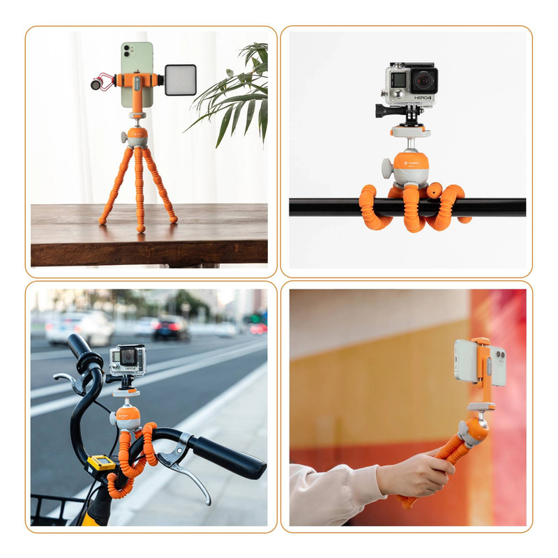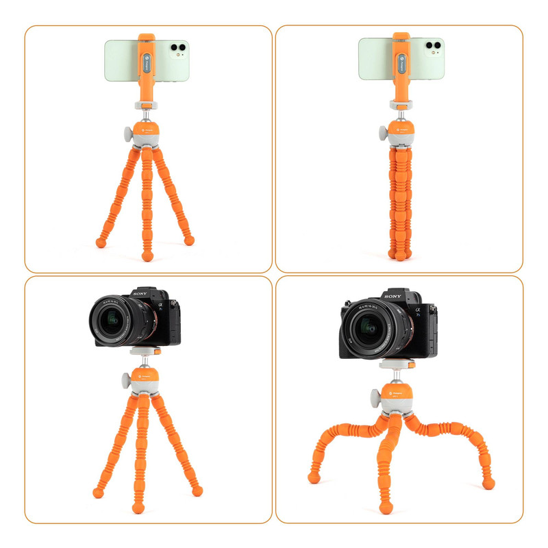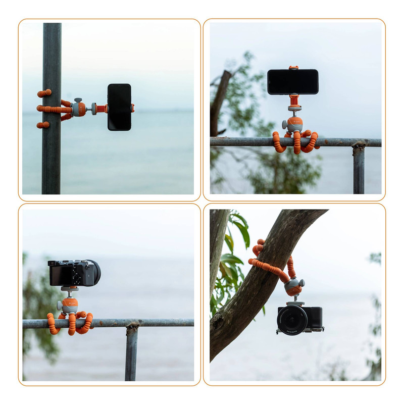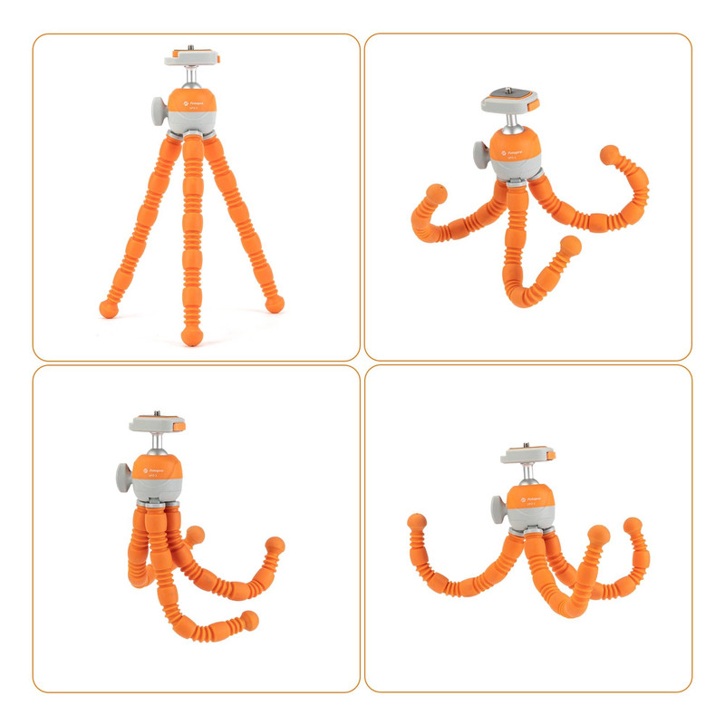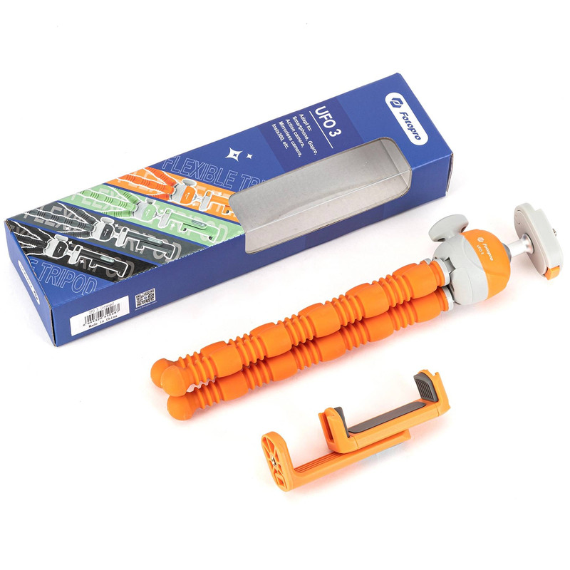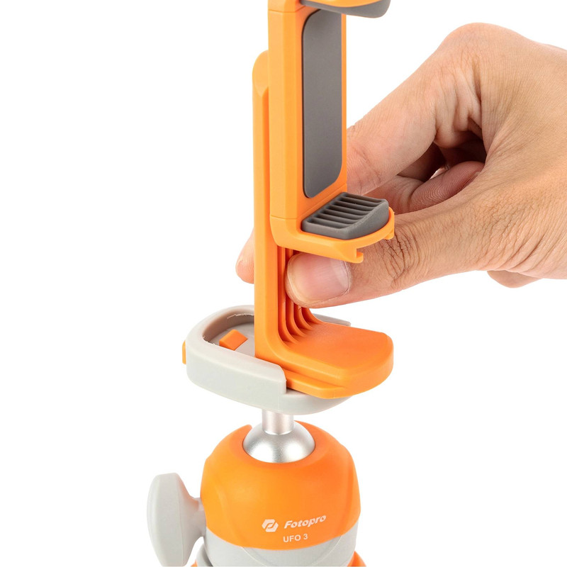 پایه منعطف فوتوپرو Fotopro UFO 3 با پایههایی از جنس لاستیک فشرده و باکیفیت طراحی شده است که آن را مقاوم و بادوام میسازد. پایههای این سهپایه قابلیت خم شدن به اشکال مختلف را دارند و میتوان آن را به سطوح گوناگون — حتی سطوح صاف یا زاویهدار — متصل کرد. UFO 3 هم برای دوربینهای عکاسی و هم برای گوشیهای هوشمند مناسب است، زیرا به نگهدارنده موبایل داخلی مجهز شده است.