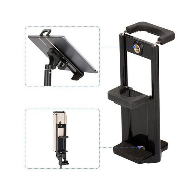 سایز:8×6.5×14 سانتی متر -امکان نصب روی انواع سه پایه و تک پایه -امکان نصب انواع گوشی تلفن همراه و تبلت -این هولدر روی پیچ 1/4 اینچی نصب میشود -گوشی موبایل و یا تبلت بصورت جداگانه یا همزمان در میان یکی از گیرههای فنری دو طرف آن قرار خواهد گرفت