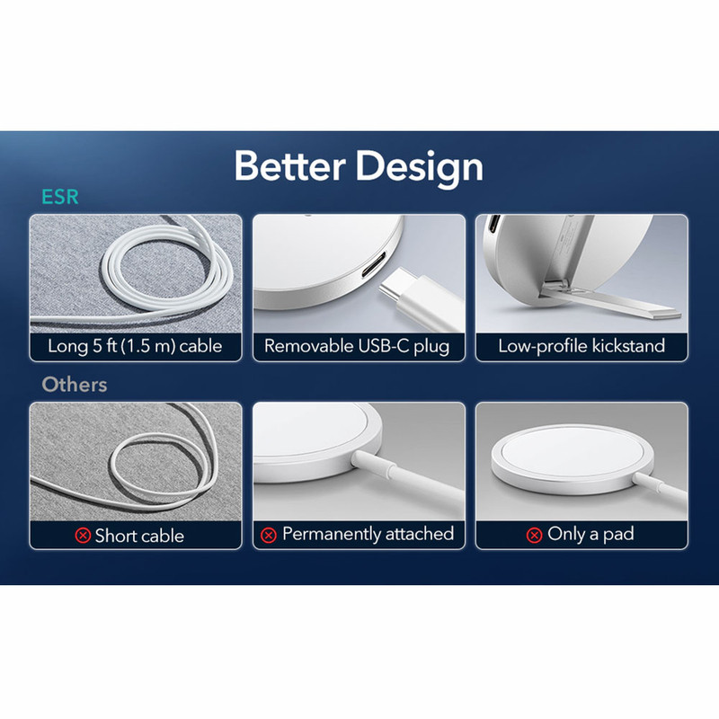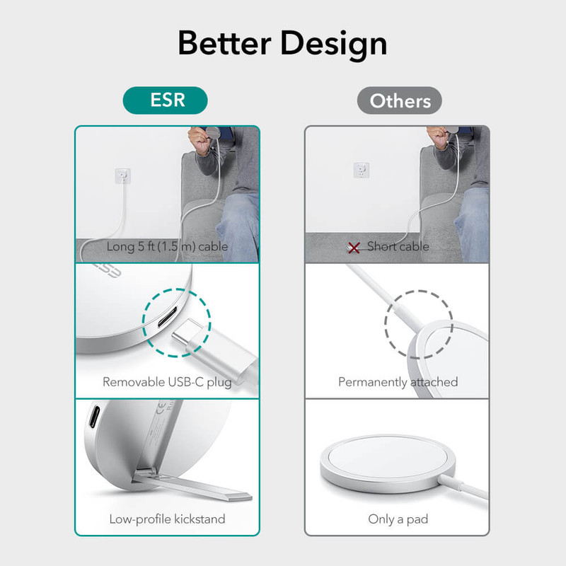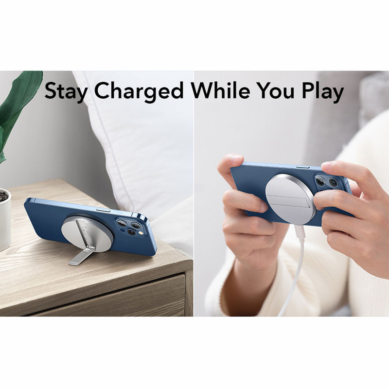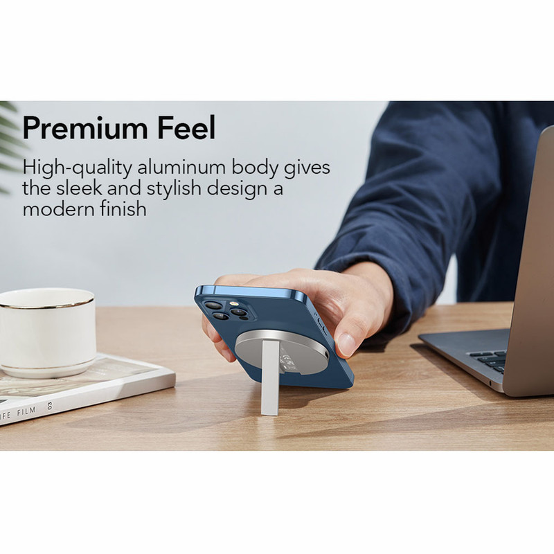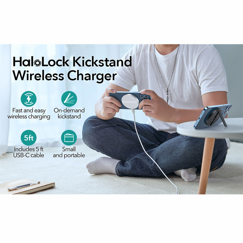 HaloLock Kickstand With MagSafe از کمپانی ESR به صورت اختصاصی برای آیفون های سری 12 و 13 و قاب های که از MagSafe پشتیبانی میکنند مورد استفاده قرار می گیرد. این محصول از نظر کارایی مشابه MagSafe Charger می باشد با این تفاوت که کابل آن جدا می شود و میتوانید به راحتی از خود محصول به عنوان استند استفاده نمایید.طراحی فوقالعاده باریک آن به گونهای بوده که به راحتی میتوانید این محصول را در جیب خود قرار دهید و در هر جایی از آن استفاده کنید.