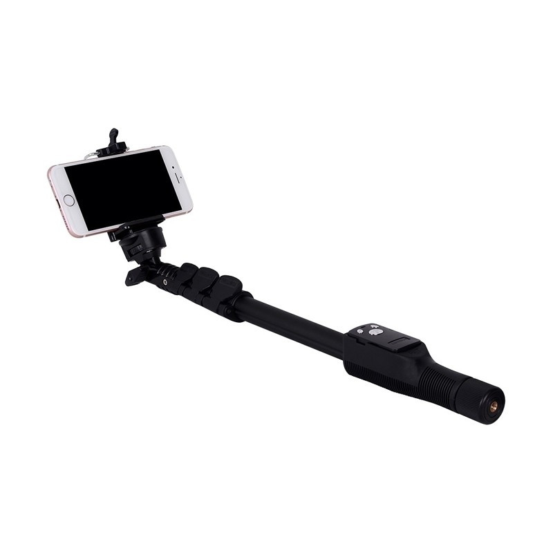 پایهی مونوپاد یانتنگ مدل YT1288-2021 با طول حداکثر 125سانتیمتر، ابزاری مناسب برای عکاسی سلفی با گوشیهای کوچکتر از 5.5 اینچ است. این محصول بدنهای از جنس آلومینیوم دارد که از چهار تکهی تلسکوپی تشکیل شده است. این تکهها بهوسیلهی گیرههای پلاستیکی به هم محکم میشوند و پس از بازکردن همهی تکهها، طول مونوپاد به 125 سانتیمتر میرسد. کمترین طول هم در حالتی که تمام تکهها جمع شدهاند، 42.5 سانتیمتر است. این محصول به لطف گریپ لاستیکی دندانهدارش، بهراحتی در دست نگهداشته و کنترل میشود. قسمت نگهدارندهی گوشی، به پایهای متصل شده که از قابلیت چرخش 360 درجه و خموراستشدن برای تنظیم زاویهی دلخواه برخوردار است.