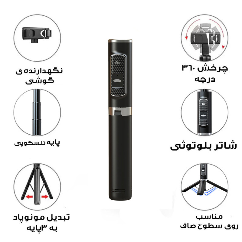 مونوپاد استند مدل P10 به شما امکان می دهد با استفاده از فناوری بلوتوث به راحتی عکس های سلفی محبوب بگیرید و فیلم برداری کنید. برای وبلاگ نویسان و کسانی که فیلم می سازند و در شبکه های اجتماعی ارسال می کنند ، طراحی شده است. این یک محصول جهانی است که حتی اگر موبایل را با موبایل جدیدی تعویض کنید همراه شما خواهد بود. زیرا با اکثر تلفن های هوشمند موجود در بازار سازگار است.دارای سری قابل چرخش 360 درجه و قابل تنظیم . استفاده از این محصول بسیار آسان است. شما به هیچ نرم افزار اضافی احتیاج ندارید. فقط تلفن را از طریق بلوتوث با یک سلفی وصل کنید. این محصول در حالت بسته 22 سانتی متر و بعد از باز شدن در حالت کلی 84 سانتی متر می باشد. این قابلیت به شما امکان می دهد یک صحنه گسترده را در قاب بگیرید. شما می توانید به راحتی همه دوستان خود را در یک عکس مشترک جا دهید! این مجموعه شامل یک کنترل از راه دور است که به لطف آهنربا داخلی کاملاً به جایگاه خاص خود چسبیده است.