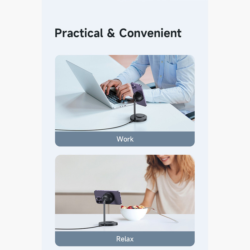 این محصول با طراحی 2 در 1 خود، امکان شارژ همزمان گوشیهای هوشمند و ایرپادها (TWS) را فراهم میکند. پایه مغناطیسی قدرتمند 3300Gs این محصول، دستگاه شما را به سرعت و بهطور دقیق بهصورت خودکار تراز میکند، که تجربه شارژ را آسانتر و سریعتر میکند. همچنین این شارژر قابلیت استفاده بهعنوان پایه نگهدارنده برای گوشی در حالت عمودی را دارد که برای تماشای ویدیو یا تماسهای تصویری ایدهآل است.