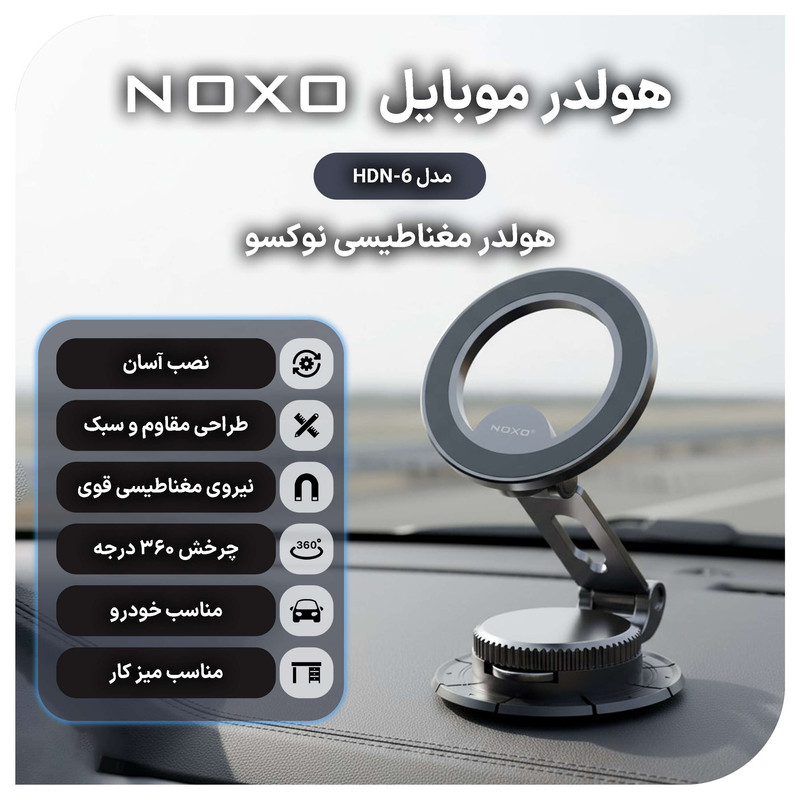 هولدر Noxo HDN-6 یک پایه نگهدارنده مغناطیسی با طراحی تاشو و بدنهای مقاوم از آلیاژ روی (Zinc Alloy) است که امکان ثابت نگه داشتن گوشی هوشمند را در خودرو با امنیت و راحتی کامل فراهم میکند. این مدل به بازوی فلزی کشویی و ریل لغزشی مجهز شده است تا کاربر بتواند فاصله و زاویه دلخواه را بهسادگی تنظیم کند.