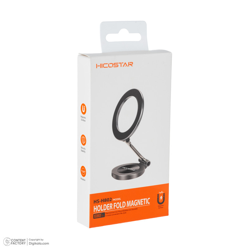 پایه نگهدارنده HICOSTAR مدل HS-H802 با طراحی مدرن و ساختاری مستحکم ،تجربه ای متفاوت از نگه داشتن گوشی موبایل را برای شما فراهم میکند.این مدل با بهره گیری از سطح مغناطیسی قوی ،به راحتی گوشی شما را جذب کرده و بدون نیاز به گیره یا قفل آن را محکم و بی حرکت نگه میدارد.