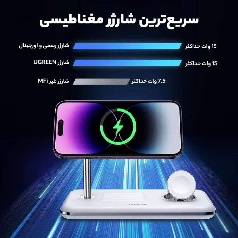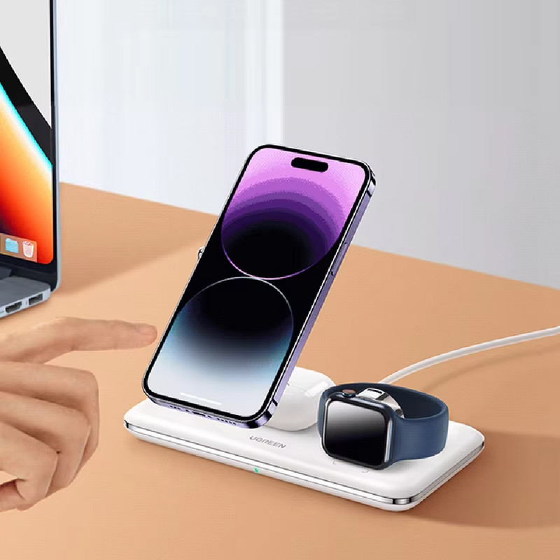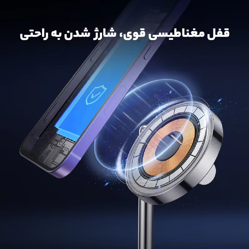 شارژر بی سیم مغناطیسی همچنین میتواند به عنوان پایه عمل کند تا گوشی و ساعت شما را نگه دارد. کنترل کاملی بر زاویه نمایش داشته باشید، از 20 تا 90 درجه برای گوشی و 0 تا 90 درجه برای ساعت. چه در حال ویدئو کنفرانس، جستجوی اطلاعات، استفاده از فیس تایم، تماشای ویدئوها، یا در حالت کنار تخت باشید.
