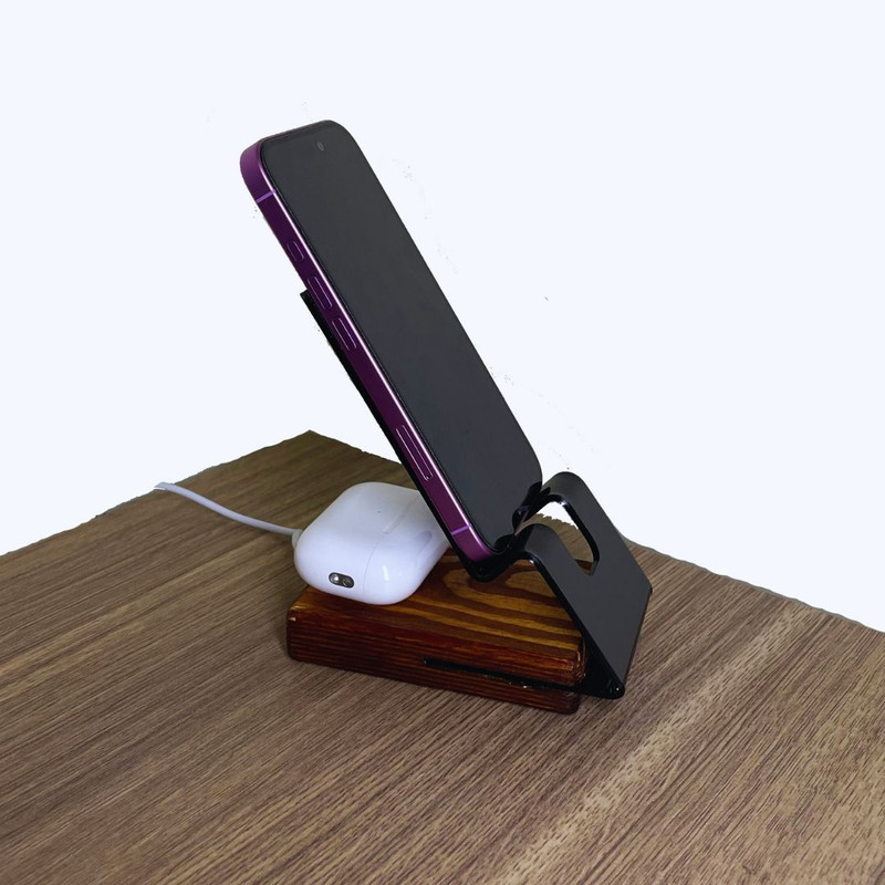 این محصول به گونهای طراحی شده است که علاوه بر نگهداری موبایل، امکان عبور کابل شارژ از داخل پایه را نیز فراهم میکند تا فرآیند شارژ آسانتر انجام شود. در بخش چوبی آن، جایگاه ویژهای برای قرارگیری شارژر وایرلس ساعت هوشمند و ایرپاد تعبیه شده است تا کاربران بتوانند دستگاههای خود را بهطور منظم و در یک مکان مشخص شارژ کنند. استفاده از چوب مرغوب و پلاستیک فشرده باکیفیت، باعث شده است این پایه ساختاری مقاوم و بادوام داشته باشد و برای استفاده طولانیمدت مناسب باشد.