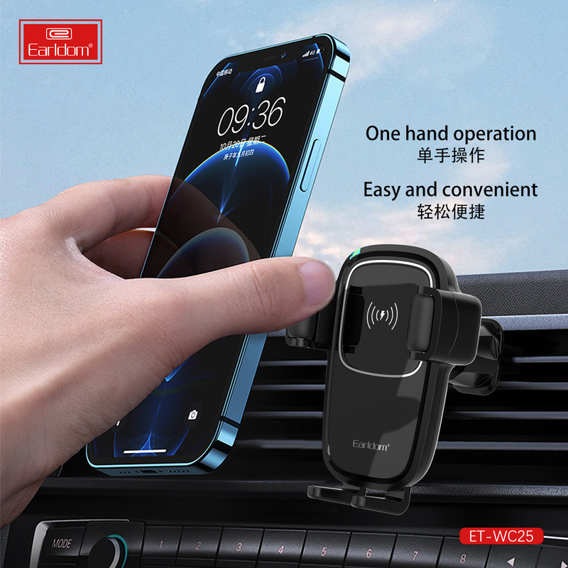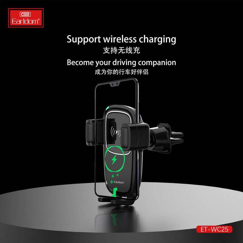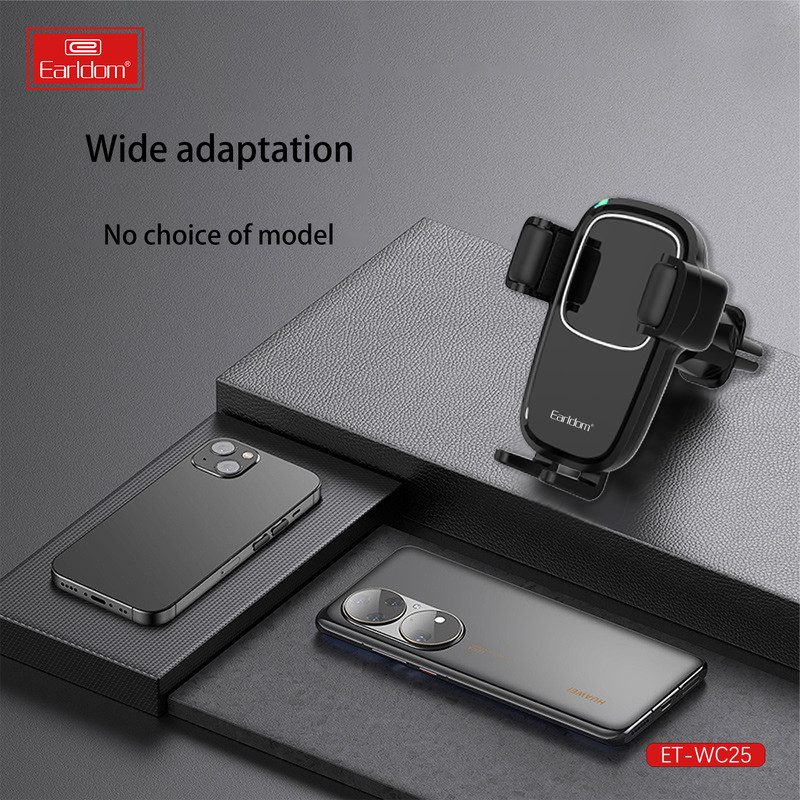 هولدر و شارژر وایرلس دریچه کولری ارلدام مدل ET-WC25 از طریق گیره قرار گرفته در پشت خود به دریچه کولر متصل می شود و گوشی شما را به خوبی نگه می دارد. این هولدر از دو بازو در دو طرف و یک پایه نگه دارنده در زیر تشکیل شده که به صورت مثلثی با یکدیگر در ارتباط هستند. در پشت این پایه نگهدارنده یک کلید تعبیه شده که با فشار دادن آن ، بازوها باز می شود و بعد از قرار دادن گوشی موبایل روی هولدر باید بازوها را با دست جمع کنید تا گوشی را محکم بین خود نگه دارند . پد پشتی ارلدام WC25 مجهز به شارژر وایرلس بوده و این امر باعث شده تا شما بتوانید گوشی خود را در حالت استند شارژ کنید البته این نکته قابل ذکر بوده که گوشی شما باید مجهز به فناوری شارژ وایرلس باشد. این دستگاه دارای شارژ هوشمند سریع بوده به صورتی که پس از قرار دادن گوشی روی آن، گوشی شما را با خروجی متناسب آن شارژ میکند. حداکثر توان خروجی این شارژر 15 وات است. این شارژر انرژی خود را از طریق پورت تایپ سی قرار گرفته در زیر خود تأمین می کند و شما به راحتی می توانید آن را از طریق کابل به شارژر فندکی متصل کنید. شدت جریان و ولتاژ ورودی این هولدر با توجه به مشخصات گوشی شما، آن را با توانهای 5W/7.5W/10W/15W شارژ کند. جنس بدنه این محصول از ABS و سیلیکون بوده که علاوه بر زیبایی، فرم و ظاهری کلاسیک و تلفیقی نیز به خود گرفته است. بر روی بازوهای این محصول لایه های محافظی قرار گرفته است تا از گوشی شما در برابر خط و خش محافظت کند و به بدنه آن آسیبی وارد نکند. ابعاد این محصول به گونه ای است که فضای بسیار کمی از اتومبیل شما را اشغال می کند و شما با داشتن این هولدر هم گوشی خود را در حالت استند نگه می دارید و هم همزمان آن را شارژ می کنید. سری این هولدر قابلیت چرخش 360 درجه دارد و این امر باعث شده تا شما به راحتی بتوانید زاویه دید خود را بر اساس گوشی موبایل خود تنظیم کرده و در بهترین حالت ممکن از گوشی خود استفاده کنید. همچنین یک عدد کابل شارژ از نوع تایپ سی به شما تقدیم می شود.